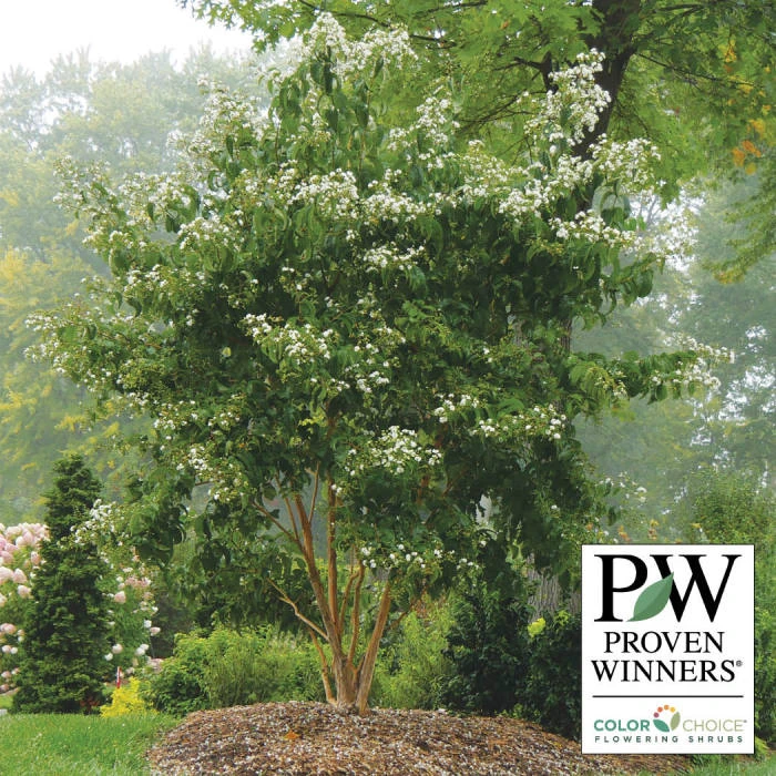 Zones 5-9 (P.P. 30763) A beautiful, small tree that offers four seasons of interest. In spring, rich green leaves emerge, and as they mature through the summer, they become twisted at the tips. In late summer, when other plants are winding down, the tree bears large clusters of fragrant, white flowers that attract pollinators galore. After several weeks, the flowers fade and reveal brilliant red bracts that last through fall. In winter, the beautiful form of the tree is revealed and the light tan, peeling bark can be admired. Ht: 6-10′.
